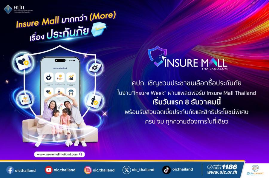 คปภ. เชิญชวนประชาชนเลือกซื้อประกันภัยในงาน “Insure Week” ผ่านแพลตฟอร์ม Insure Mall Thailand เริ่มวันแรก 8 ธันวาคมนี้ พร้อมรับส่วนลดเบี้ยประกันภัยและสิทธิประโยชน์พิเศษ ครบ จบ ทุกความต้องการในที่เดียว