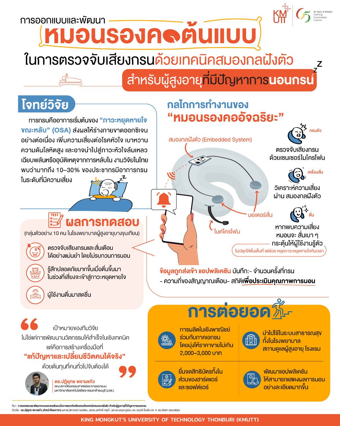 “ใครกรนต้องรู้! มจธ. พัฒนา ‘หมอนรองคออัจฉริยะ’ สั่นเตือนก่อนคุณหยุดหายใจ” มหาวิทยาลัยเทคโนโลยีพระจอมเกล้าธนบุรี (มจธ.)