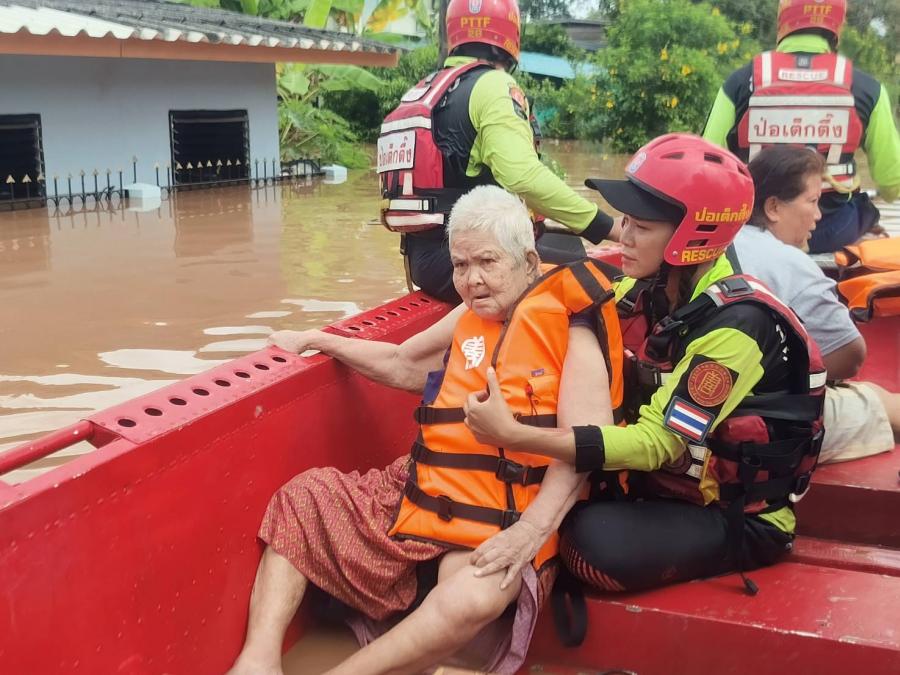 โดยทีมบรรเทาสาธารณภัย นำกำลังเจ้าหน้าที่กู้ชีพกู้ภัยเคลื่อนย้ายคุณยายซึ่งเป็นผู้ป่วยติดเตียงมาไว้ในพื้นที่ปลอดภัย