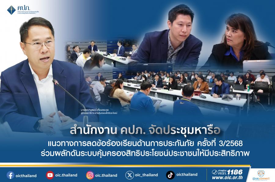 สำนักงานคณะกรรมการกำกับและส่งเสริมการประกอบธุรกิจประกันภัย (สำนักงาน คปภ.) จัดการประชุมหารือแนวทางการคุ้มครองสิทธิประโยชน์ประชาชนด้านการประกันภัยร่วมกับภาคธุรกิจ ครั้งที่ 3/2568 ของสายคุ้มครองสิทธิประโยชน์ โดยในวันที่ 23 กันยายน 2568 เป็นการประชุมร่วมกับผู้แทนบริษัทประกันชีวิต มีนางณปภัช เดชธัญญนนท์ ผู้อำนวยการฝ่ายอาวุโส ฝ่ายคุ้มครองสิทธิประโยชน์ และนายธัญญวัฒน์ ตั้งพงษาพันธ์ ผู้ทรงคุณวุฒิด้านกฎหมาย เป็นผู้ดำเนินการประชุม และในวันที่ 25 กันยายน 2568 เป็นการประชุมร่วมกับผู้แทนบริษัทประกันวินาศภัยทุกบริษัท พร้อมผู้แทนจากสมาคมประกันวินาศภัยไทย มีนายคณานุสรณ์ เที่ยงตระกูล ผู้ช่วยเลขาธิการ สายคุ้มครองสิทธิประโยชน์ เป็นผู้ดำเนินการประชุม พร้อมด้วยผู้บริหารและเจ้าหน้าที่สายงานที่เกี่ยวข้อง