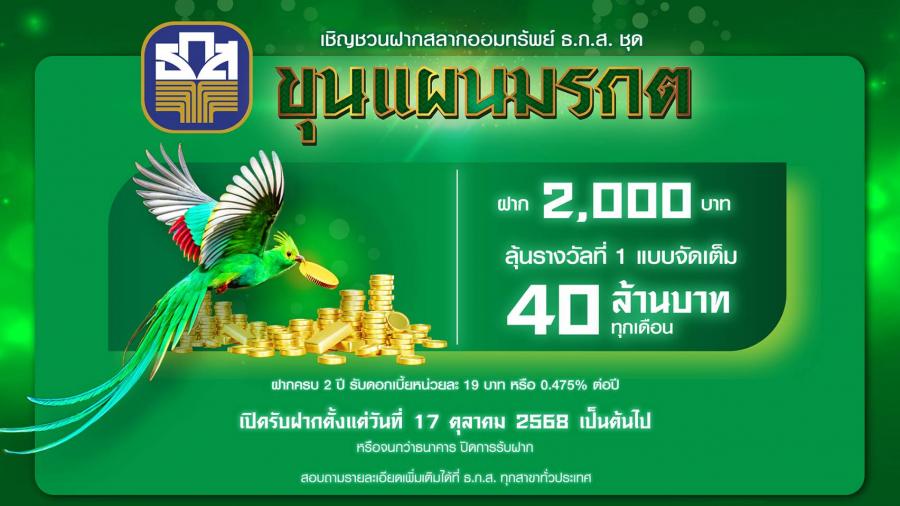 สลากออมทรัพย์ ธ.ก.ส. ชุด ขุนแผนมรกต ฝาก 2000 บาท ครบ 2 ปี รับดอกเบี้ยหน่วยละ 19 บาท ลุ้นรวย 40 ล้านบาท เริ่ม 17 ต.ค. 68ธนาคารเพื่อการเกษตรและสหกรณ์การเกษตร