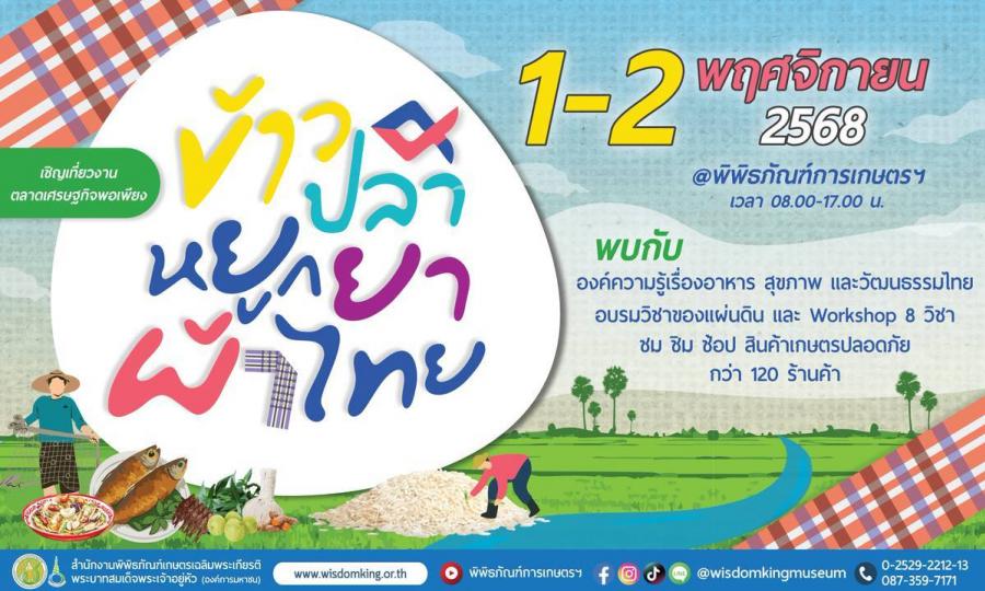 ขอเชิญประชาชนทุกท่านร่วมเรียนรู้ สืบสานภูมิปัญญาไทยตามรอยพระราชดำริ และร่วมน้อมถวายความอาลัยแด่สมเด็จพระนางเจ้าสิริกิติ์ พระบรมราชินีนาถ พระบรมราชชนนีพันปีหลวง ผู้เป็นที่รักยิ่งของปวงชนชาวไทย และร่วมทำจิตอาสา การทำริบบิ้นไว้อาลัย เพื่อมอบให้กับประชาชน และร่วมไว้อาลัยด้วยการสวมเสื้อผ้าชุดสุภาพ และทำกิจกรรมน้อมรำลึก โดยการวางดอกไม้หรือพวงมาลัยสีขาว ที่บริเวณโถงอาคารเฉลิมพระเกียรติฯ 1 นิทรรศการ “พระผู้เสด็จสู่สวรรคาลัย” ได้ในงาน ตลาดเศรษฐกิจพอเพียง “ข้าวปลา หยูกยา ผ้าไทย” ระหว่างวันที่ 1 – 2 พฤศจิกายน 2568 ตั้งแต่เวลา 08.00 – 17.00 น. ณ พิพิธภัณฑ์การเกษตรเฉลิมพระเกียรติพระบาทสมเด็จพระเจ้าอยู่หัว จังหวัดปทุมธานี
