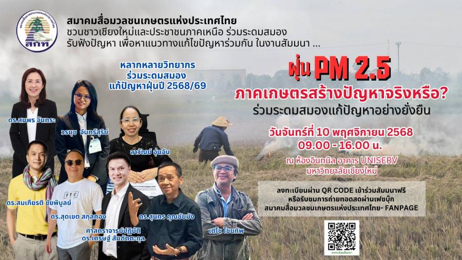 สมาคมสื่อมวลชนเกษตรแห่งประเทศไทย ... ขอเชิญชวนชาวจังหวัดเชียงใหม่ และพี่น้องภาคเหนือ เข้าร่วมสัมมนาและแสดงความคิดเห็น ... “ฝุ่น PM 2.5 ภาคเกษตรสร้างปัญหาจริงหรือ? มาร่วมระดมสมองเพื่อการแก้ไขปัญหาอย่างยั่งยืน”