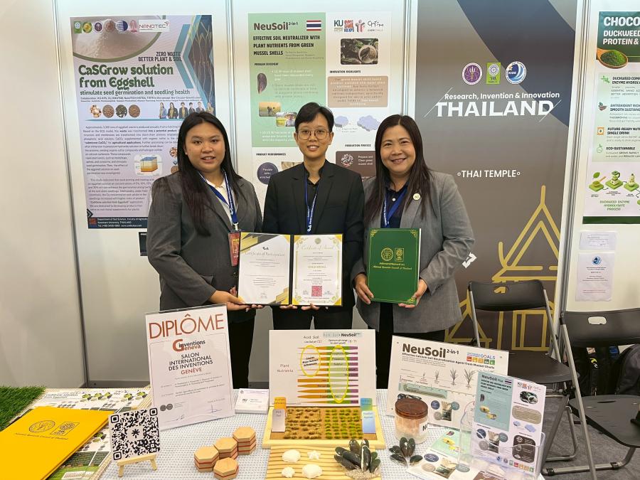 ผลงานวิจัยของทีมวิจัย ภาควิชาปฐพีวิทยา คณะเกษตร กำแพงแสน มหาวิทยาลัยเกษตรศาสตร์ ร่วมกับภาควิชาเคมี จุฬาลงกรณ์มหาวิทยาลัย ภายใต้ทุนสนับสนุนวิจัยโครงการ “นิวซอย2-in-1: เกร็ดแคลเซียมคาร์บอเนตควบปุ๋ยปรับสภาพดินเปรี้ยวจากเปลือกหอยแมลงภู่สำหรับนาข้าว” ทุนวิจัยโครงการการยกระดับนักวิจัย นักประดิษฐ์ เพื่อการพัฒนาที่ยั่งยืน Invention to Business (I-2B) ประจำปีงบประมาณ 2568 สำนักงานการวิจัยแห่งชาติ (วช.) และได้รับงบประมาณสนับสนุนการเข้าร่วมประกวดนวัตกรรม จาก สถาบันวิจัยและพัฒนาแห่งมหาวิทยาลัยเกษตรศาสตร์ (สวพ.มก.) ได้รับรางวัลเหรียญทอง Gold Medal Award ในงาน 2025 Kaohsiung International Invention & Design Expo ซึ่งจัดขึ้นระหว่าง วันที่ 4-6 ธันวาคม 2568 ณ เมืองเกาสง ไต้หวัน