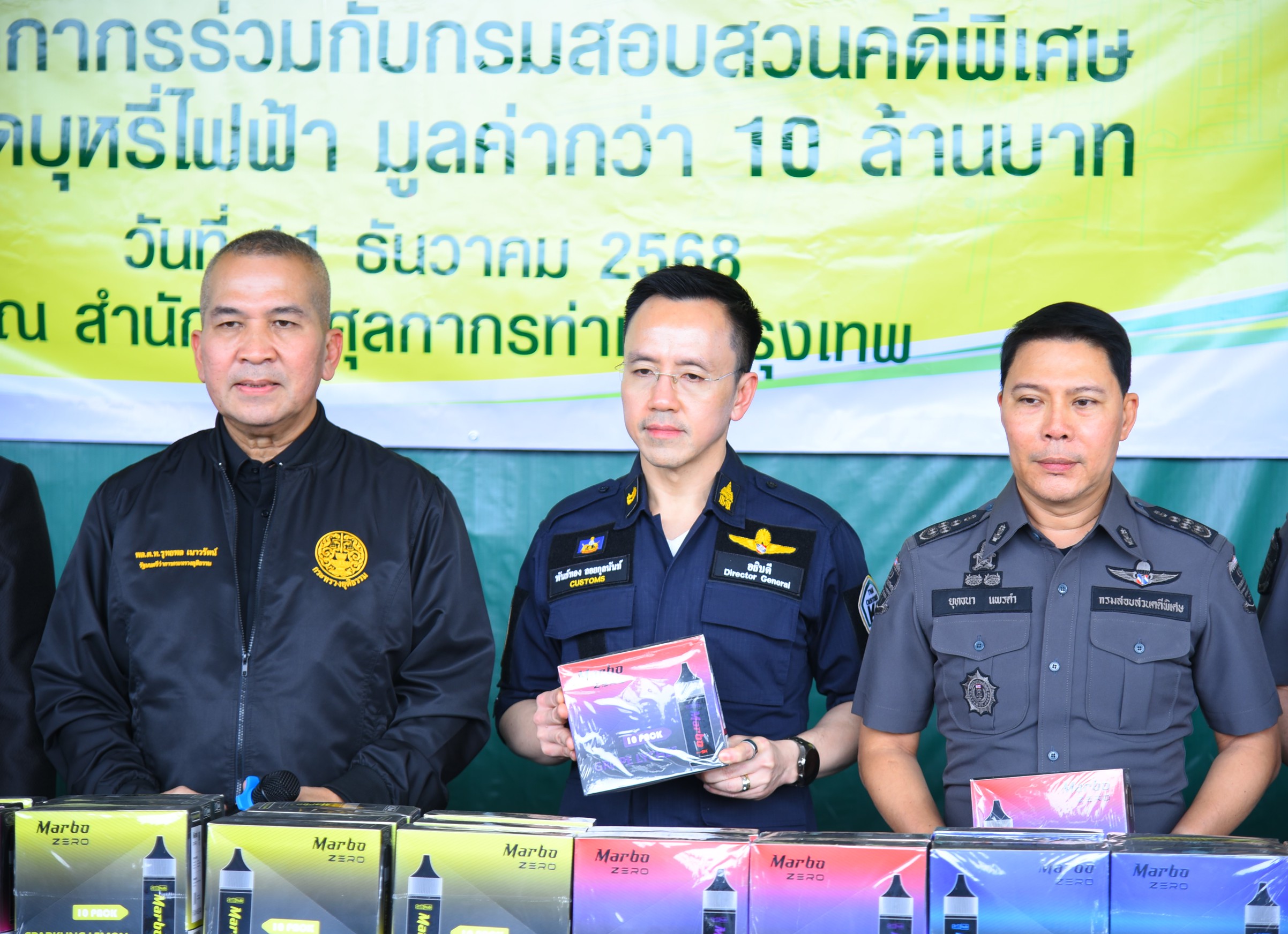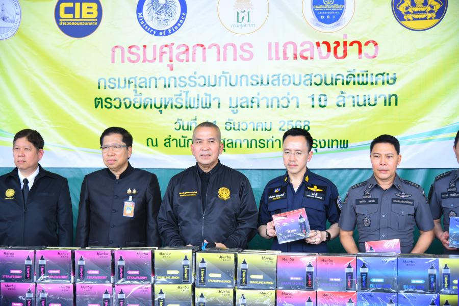 ทั้งนี้ จากการบูรณาการร่วมกันระหว่างกรมศุลกากรและหน่วยงานอื่น ๆ ที่เกี่ยวข้องทำให้สามารถป้องกันและปราบปรามสินค้าผิดกฎหมายได้อย่างมีประสิทธิภาพและสามารถปกป้องสังคมได้อย่างปลอดภัย สำหรับสถิติการจับกุมบุหรี่ไฟฟ้าและอุปกรณ์ในปีงบประมาณ 2569 (ตั้งแต่เดือน 1 ตุลาคม – 11 ธันวาคม 2568) ตรวจยึดได้ 123870 ชิ้น/อัน/กล่อง/เซต มูลค่ารวมทั้งสิ้น 25170659 บาท