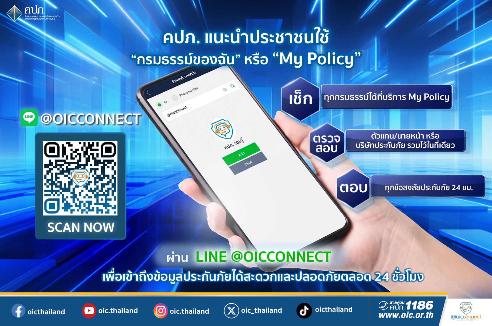 คปภ. แนะนำประชาชนใช้บริการ ’’กรมธรรม์ของฉัน’’ หรือ ’’My Policy’’ ผ่าน LINE @OICConnect เพื่อเข้าถึงข้อมูลประกันภัยได้สะดวกและปลอดภัยตลอด 24 ชั่วโมง
