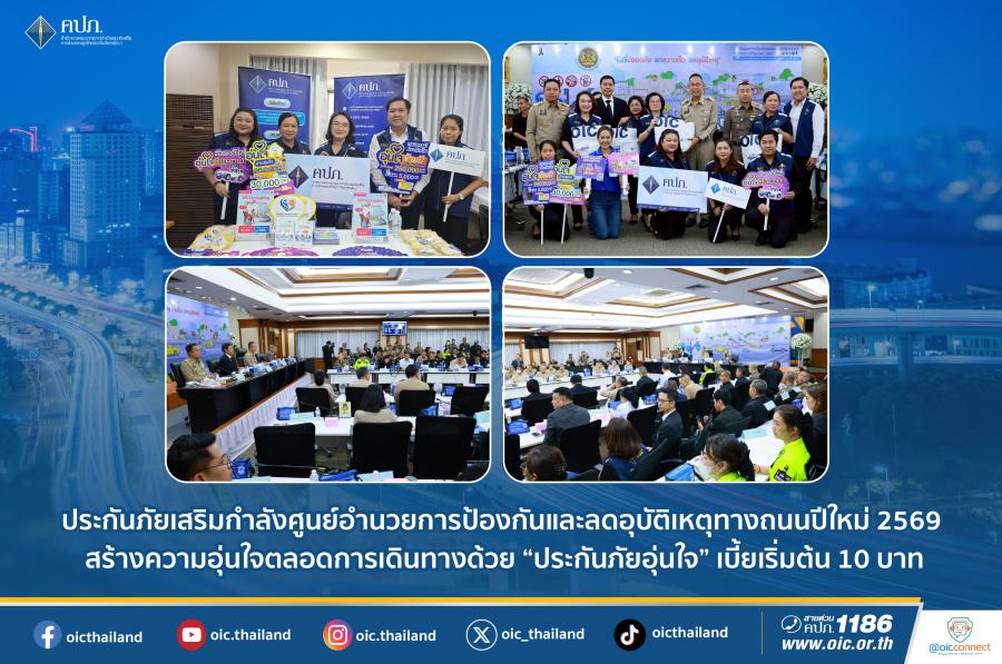 นายชูฉัตร ประมูลผล เลขาธิการ คปภ. ได้มอบหมายผู้แทนสำนักงาน คปภ. เข้าร่วมพิธีเปิดศูนย์อำนวยการป้องกันและลดอุบัติเหตุทางถนนช่วงเทศกาลปีใหม่ พ.ศ. 2569 ณ ห้องประชุมกรมป้องกันและบรรเทาสาธารณภัย โดยมีนายชัยวัฒน์ ชื่นโกสุม รองปลัดกระทรวงมหาดไทย เป็นประธาน ซึ่งศูนย์ดังกล่าวจะมีบทบาทสำคัญในการสั่งการและประสานงานด้านความปลอดภัยทางถนน พร้อมกันนี้ เลขาธิการ คปภ. ยังได้กำชับสำนักงาน คปภ.ทั่วประเทศ ร่วมบูรณาการการทำงานร่วมกับศูนย์อำนวยการของแต่ละจังหวัด และหน่วยงานภาคีเครือข่าย อย่างใกล้ชิดตั้งแต่วันที่ 31 ธันวาคม 2568 ถึงวันที่ 5 มกราคม 2569 ตลอดช่วง 7 วันอันตรายในการดูแลและให้คำปรึกษาด้านการประกันภัยตลอด 24 ชั่วโมง ผ่านสายด่วน คปภ. 1186 และ Line Official Account “คปภ. รอบรู้” หรือ OIC Connect