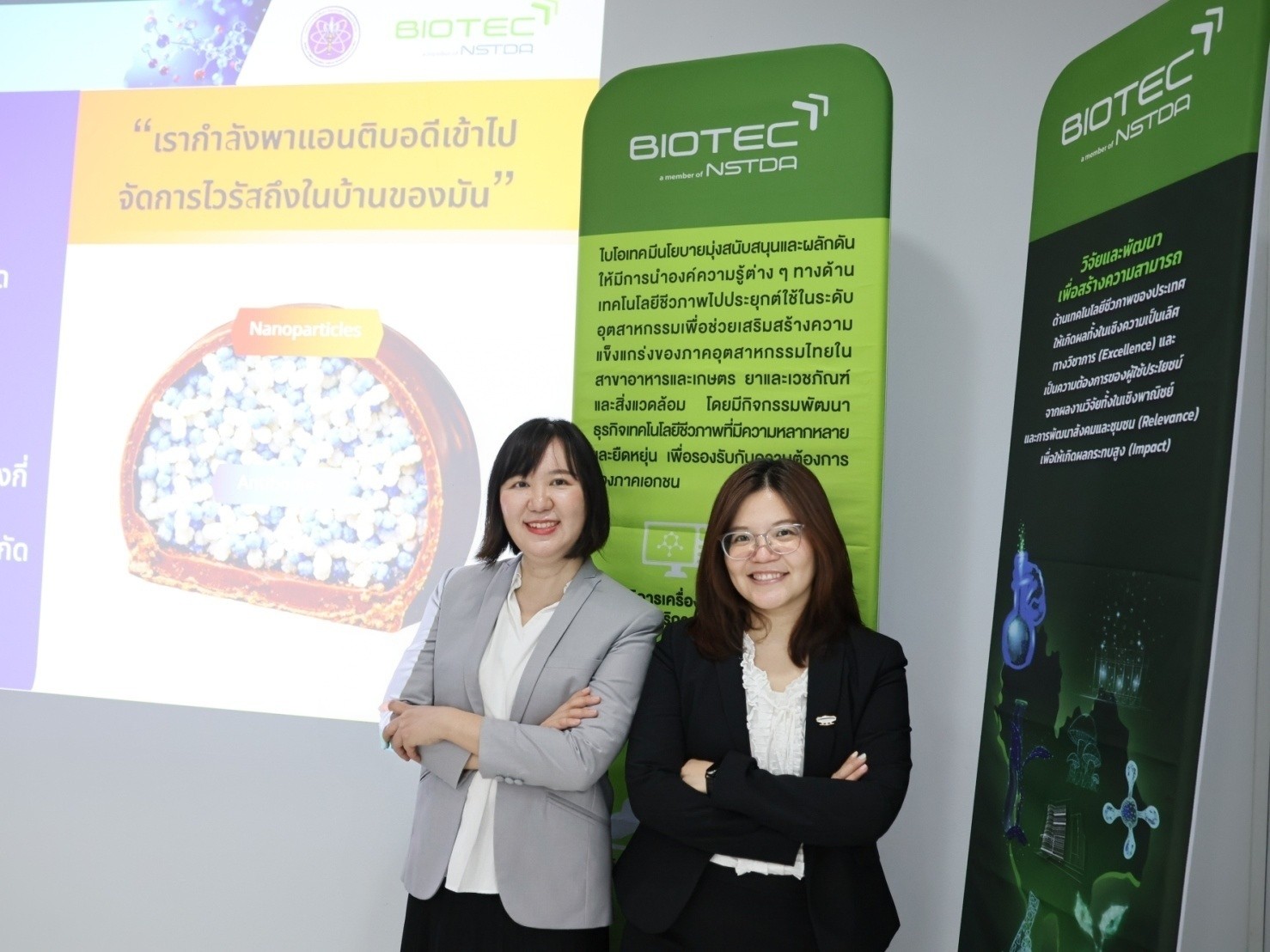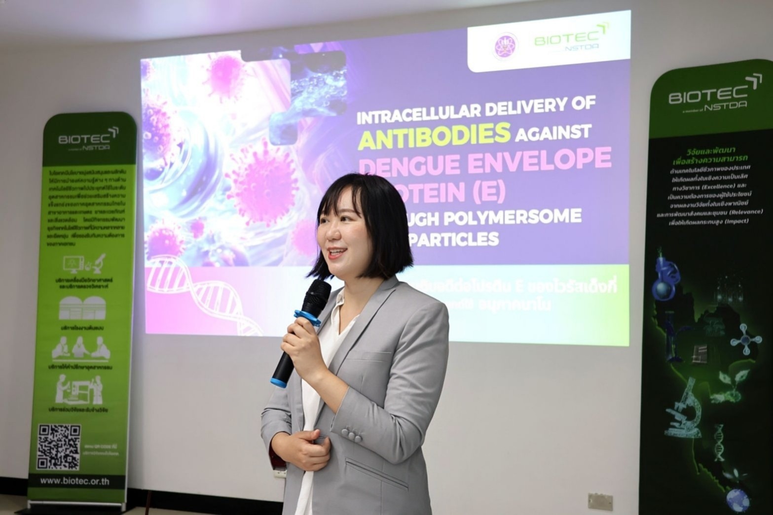 (24 กุมภาพันธ์ 2569) ณ อาคารวิจัยโยธี สวทช. - ดร.ร่มฉัตร ไกรว่อง นักวิจัยจากทีมวิจัยชีววิทยาโมเลกุลของไวรัสเด็งกี่และฟลาวิไวรัส กลุ่มวิจัยเทคโนโลยีชีวภาพระดับโมเลกุลทางการแพทย์ ศูนย์พันธุวิศวกรรมและเทคโนโลยีชีวภาพแห่งชาติ (ไบโอเทค) สำนักงานพัฒนาวิทยาศาสตร์และเทคโนโลยีแห่งชาติ (สวทช.) ในฐานะหัวหน้าโครงการวิจัยเรื่อง “การนำส่งแอนติบอดีที่จำเพาะต่อโปรตีนของไวรัสเด็งกี่เข้าสู่เซลล์โดยใช้อนุภาคนาโนชนิดโพลีเมอร์ (Investigation of Dengue-infected Cells Treated with Antibody-Nanoparticles: Host and Viral Views)” พร้อมด้วย ผศ.ดร.นิสา ปฏิการมณฑล นักวิจัยร่วมในโครงการ อาจารย์ประจำภาควิชาเทคโนโลยีชีวภาพ คณะวิทยาศาสตร์ มหาวิทยาลัยมหิดล ได้นำเสนอความก้าวหน้าของงานวิจัย โดยงานวิจัยนี้มุ่งพัฒนาระบบอนุภาคนาโนชนิดโพลีเมอร์สำหรับนำส่งแอนติบอดีที่จำเพาะต่อเชื้อไวรัสเด็งกี่เข้าสู่เซลล์มนุษย์โดยตรง เพื่อเพิ่มประสิทธิภาพและความแม่นยำในการรักษาโรคไข้เลือดออก