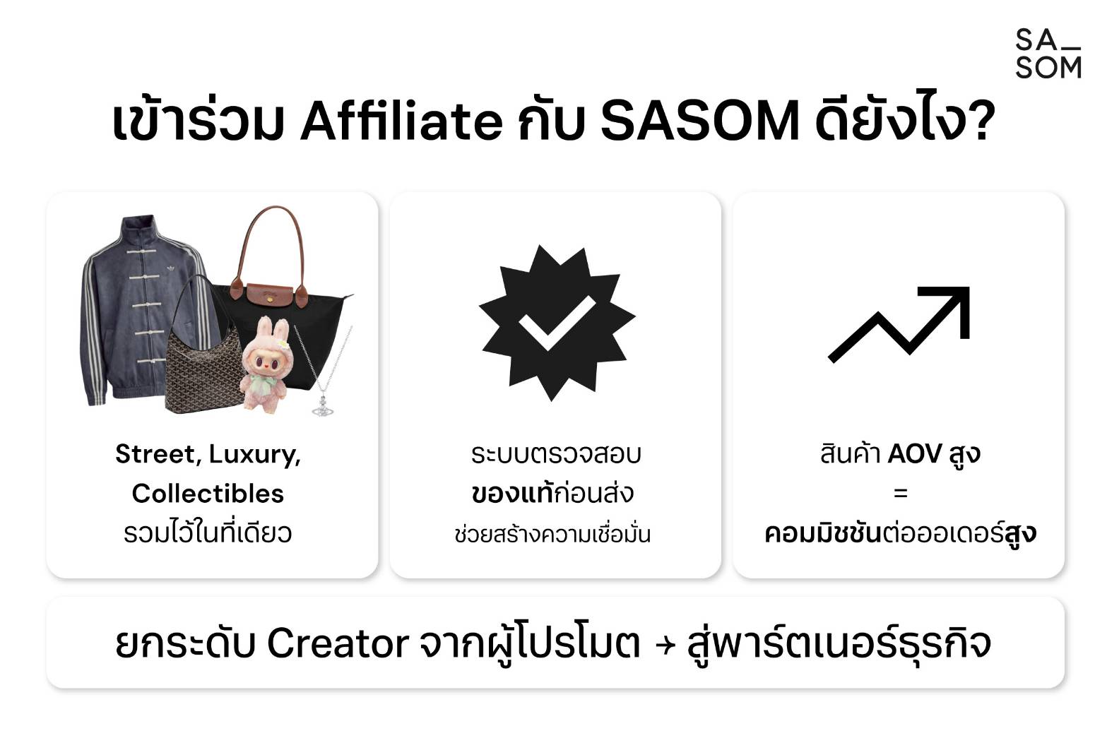 SASOM แพลตฟอร์มรวมสินค้าแฟชั่นและของสะสมของแท้ ประกาศเปิดตัว SASOM Affiliate Program (SAP) อย่างเป็นทางการ เดินหน้าสร้าง Fashion Creator Ecosystem ที่เชื่อมต่อ Creator ผู้บริโภคและตลาดแฟชั่นเข้าไว้ด้วยกันอย่างเป็นระบบ พร้อมวางรากฐานระยะยาวในการขับเคลื่อน Creator Economy ควบคู่ไปกับการเติบโตของอุตสาหกรรมแฟชั่นและสินค้าสะสมในประเทศไทย