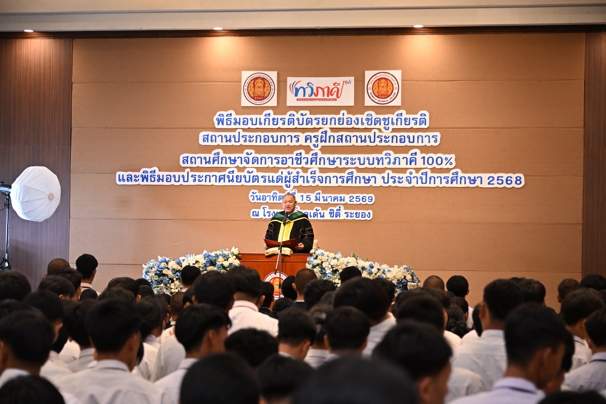 วันที่ 15 มีนาคม 2569 นายยศพล เวณุโกเศศ เลขาธิการคณะกรรมการการอาชีวศึกษา (กอศ.) เป็นประธานพิธีมอบประกาศนียบัตรแก่ผู้สำเร็จการศึกษา ประจำปีการศึกษา 2568 วิทยาลัยเทคนิคบ้านค่าย และมอบเกียรติบัตรยกย่องเชิดชูเกียรติสถานประกอบการ และครูฝึกในสถานประกอบการ ณ โรงแรมโกลเด้นซิตี้ จังหวัดระยอง