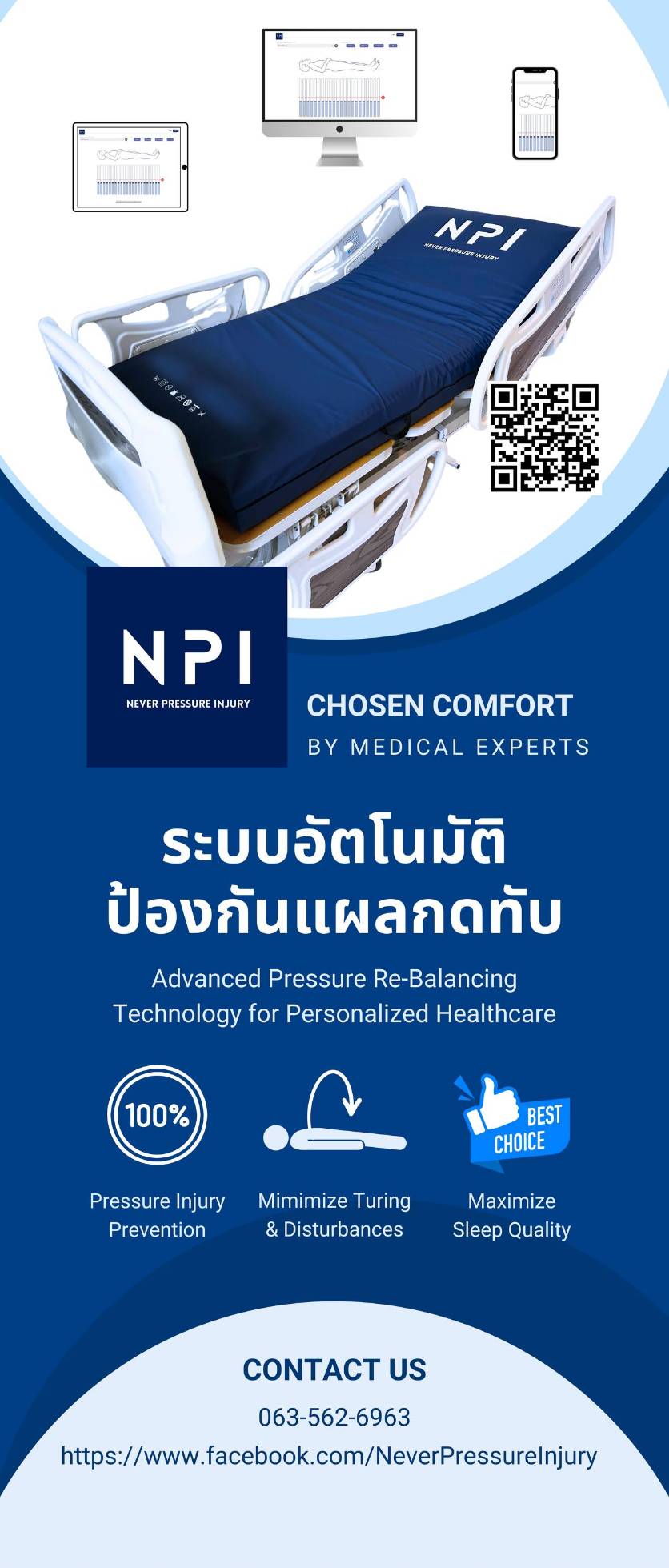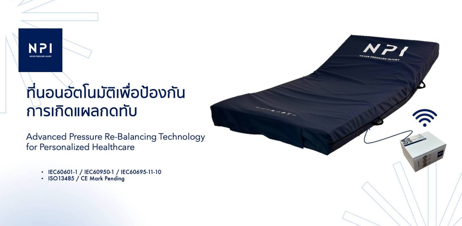 NPI ไม่ได้เป็นเพียงที่นอนที่ขยับได้เอง แต่เป็นนวัตกรรม ”หุ่นยนต์ในรูปแบบที่นอน” ด้วยระบบ AI Robotic ที่ออกแบบมาเพื่อจัดการแรงกดทับอย่างต่อเนื่องและแม่นยำ แตกต่างจากที่นอนลมทั่วไปที่ทำงานด้วยการสลับยุบพองตามรอบเวลา เพราะ NPI สามารถปรับการรองรับให้สอดรับกับสรีระของผู้ป่วยได้ตลอด24 ชั่วโมงอย่างนุ่มนวล โดยไม่รบกวนการนอนและไม่จำเป็นต้องพลิกตัวผู้ป่วยบ่อย ๆ ส่งผลให้ผู้ป่วยนอนนิ่งได้ต่อเนื่อง สบายขึ้น และช่วยลดแรงกดทับในจุดเสี่ยงได้ดีกว่าที่นอนป้องกันแผลกดทับแบบทั่วไป โดยเฉพาะในบริเวณที่ต้องการการดูแลเป็นพิเศษ