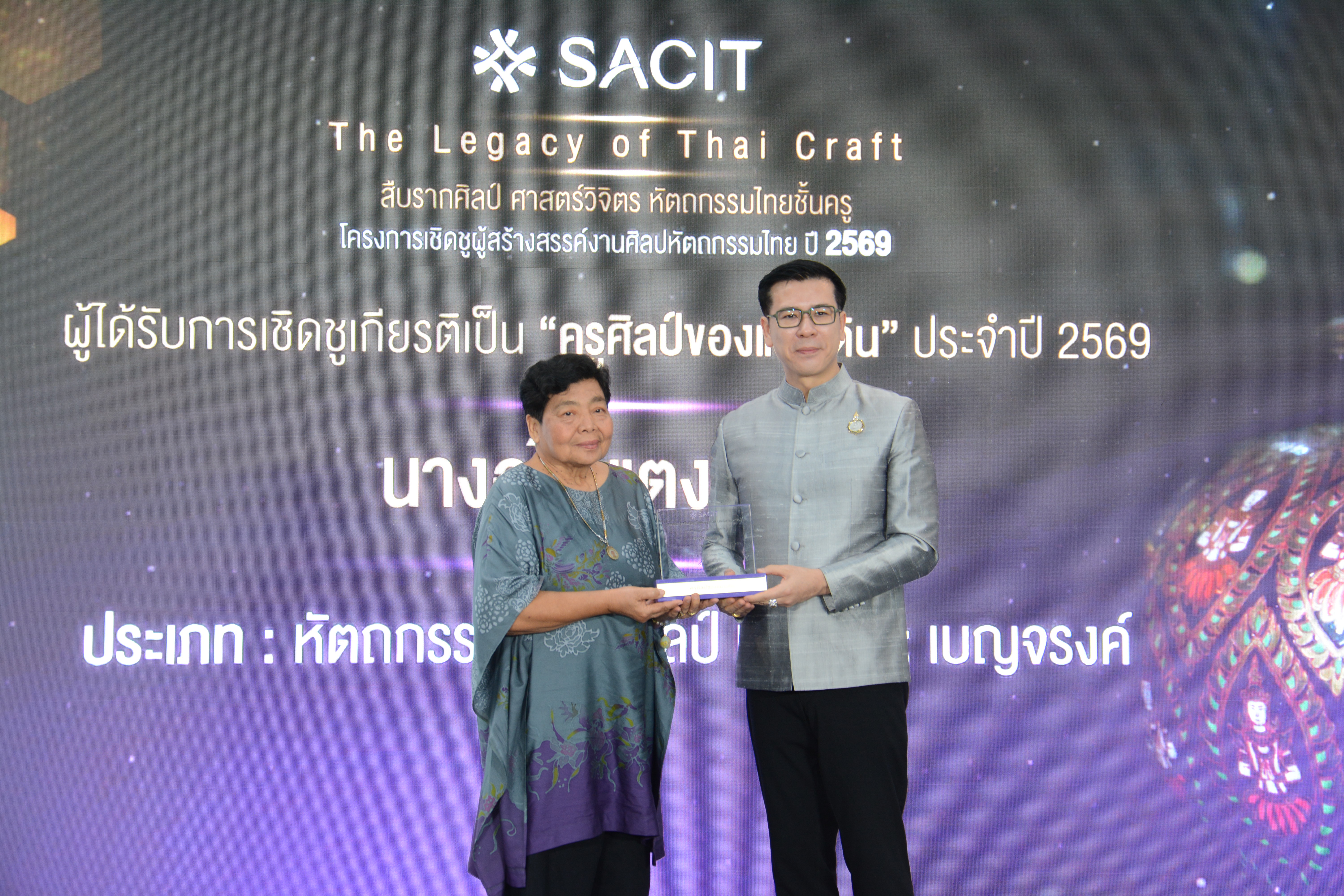 กรุงเทพฯ (20 เมษายน 2569) – สถาบันส่งเสริมศิลปหัตถกรรมไทย (องค์การมหาชน) หรือ SACIT (สศท.) จัดพิธีมอบโล่เชิดชูเกียรติ “ผู้สร้างสรรค์งานศิลปหัตถกรรมไทย ประจำปี 2569” ณ บ้านปาร์คนายเลิศ เพื่อยกย่องบุคคลผู้เป็นที่สุดแห่งงานศิลปหัตถกรรมไทย รวม 22 ท่าน นำโดย 5 ครูศิลป์ของแผ่นดิน ผู้สืบทอดงานผ้าไทยและประณีตศิลป์ระดับ Masterpieces ที่หาชมได้ยากยิ่ง พร้อมประกาศยุทธศาสตร์ดันงานฝีมือไทยก้าวสู่สากล